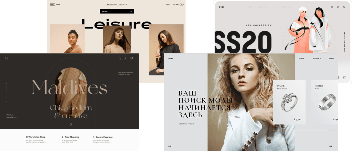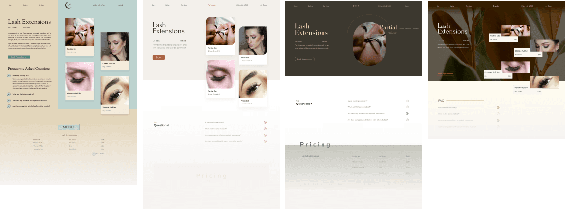 In parallel, my co-designer gathered homepage references from fashion and beauty brands to align with the client's visual direction. A client meeting clarified her preferences: neutral colors, bold typography, and visuals over text. Three brand keywords emerged — fashionable, clear, organic. I translated these into four style tiles, which we each applied to a full-page services page mockup — the site's most content-heavy page and the strongest vehicle for showing a branded system in context.