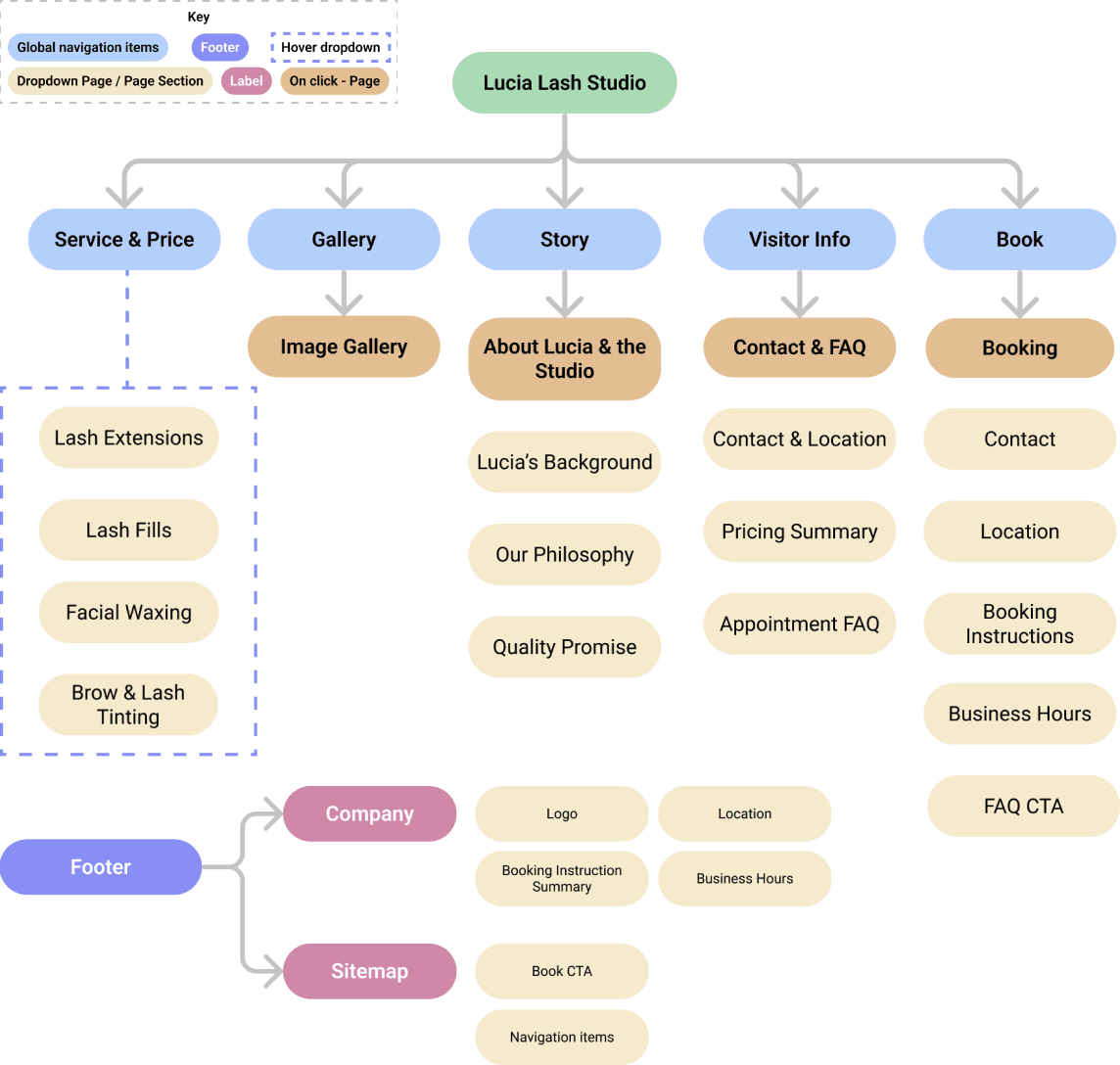 A competitive audit of salon websites informed an initial sitemap and low-fidelity prototype, built by a two-person design team. Early concept testing with a target user — a woman in her mid-20s who wasn't a frequent salon-goer — surfaced usability issues early and grounded the problem space. Her feedback made the stakes of web design quality clear: in her experience, the effort a studio puts into its website signals the quality of the studio itself.